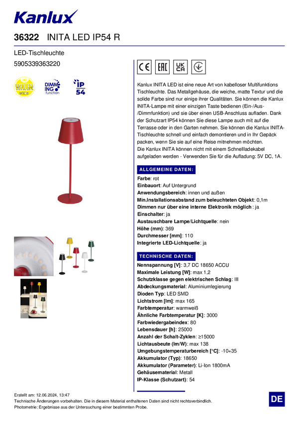Lampa stołowa LED na baterie Kanlux Inita 36322 LED wbudowany na stałe 1.2 W czerwony 165.00 lm