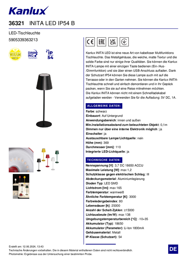 Lampa stołowa LED na baterie Kanlux Inita 36321 LED wbudowany na stałe 1.2 W czarny 165.00 lm
