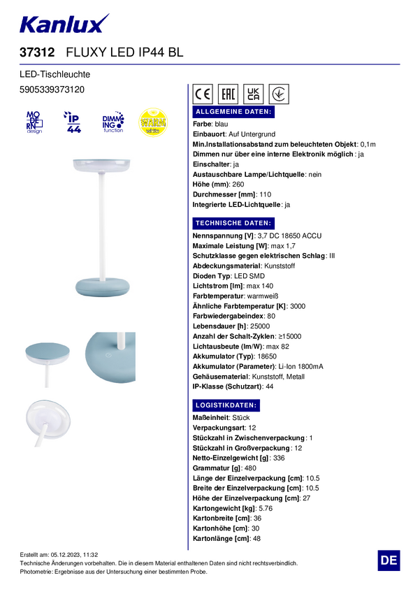 Lampa stołowa LED na baterie Kanlux Fluxy 37312 LED wbudowany na stałe 1.7 W niebieski