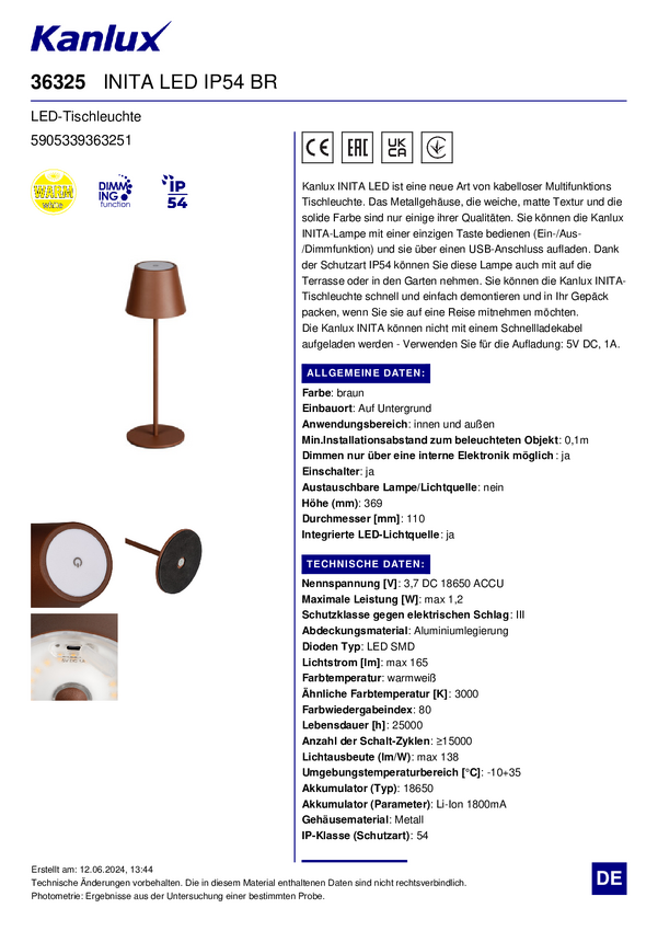 Lampa stołowa LED na baterie Kanlux Inita 36325 LED wbudowany na stałe 1.2 W brązowy