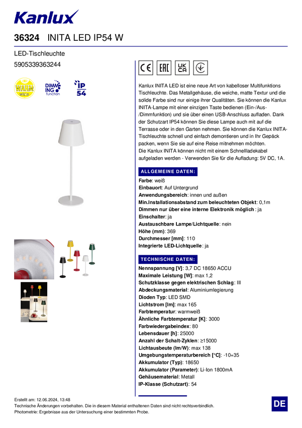 Lampa stołowa LED na baterie Kanlux Inita 36324 LED wbudowany na stałe 1.2 W biały 165.00 lm