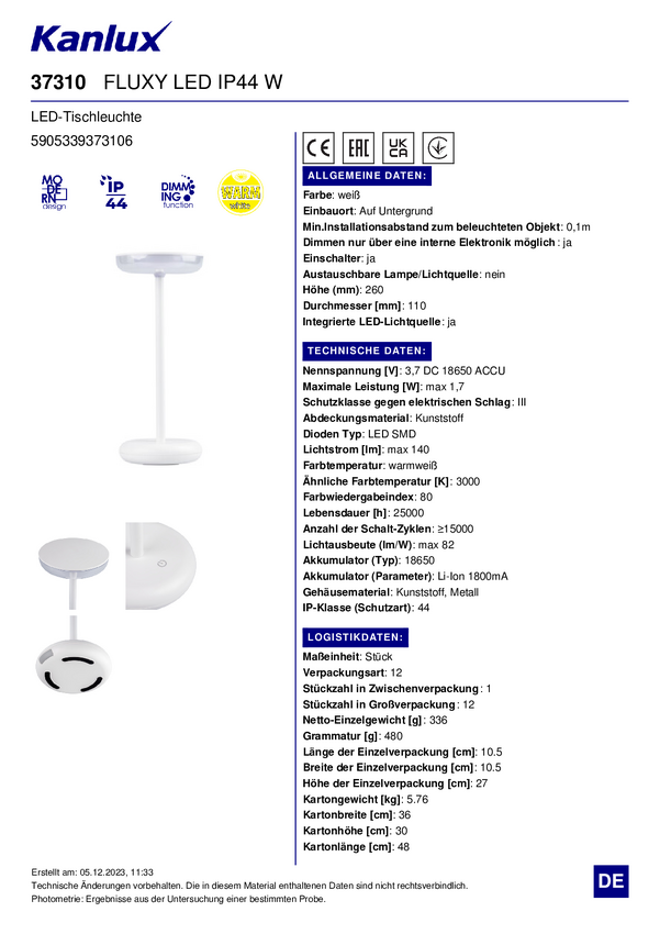 Lampa stołowa LED na baterie Kanlux Fluxy 37310 LED wbudowany na stałe 1.7 W biały