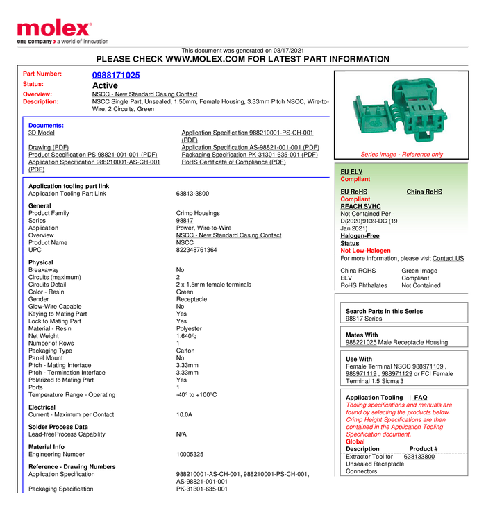 Molex Obudowa złącza pin żeńskiego na kabel Ilość pinów 2 Wymiary siatki: 3.33 mm 988171021 1 szt. karton