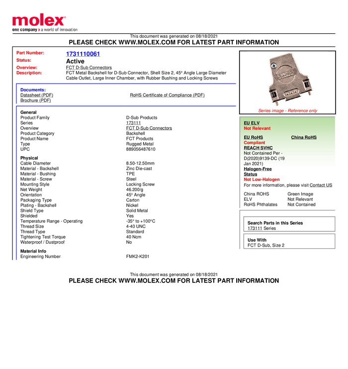 Molex Molex MOL Power & Signal Sol. 1731110061 Obudowa złącza D-SUB 1 szt. karton