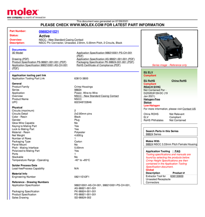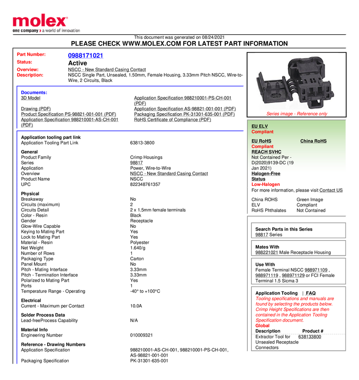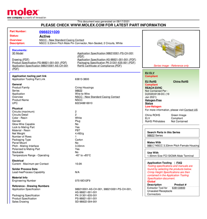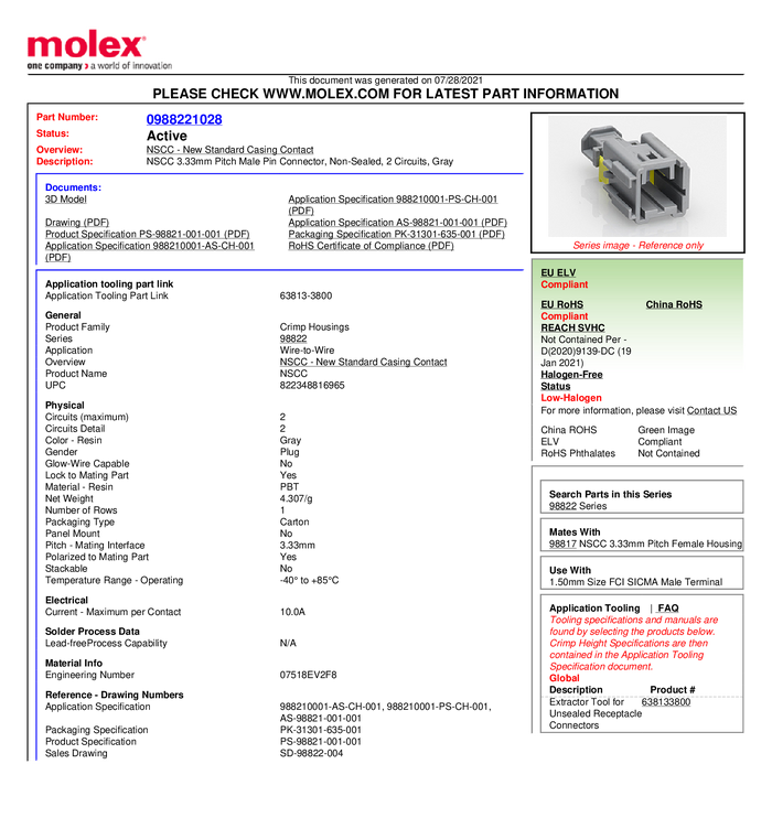 Molex Obudowa złącza pin żeńskiego na kabel Ilość pinów 2 Wymiary siatki: 3.33 mm 988221028 1 szt. karton