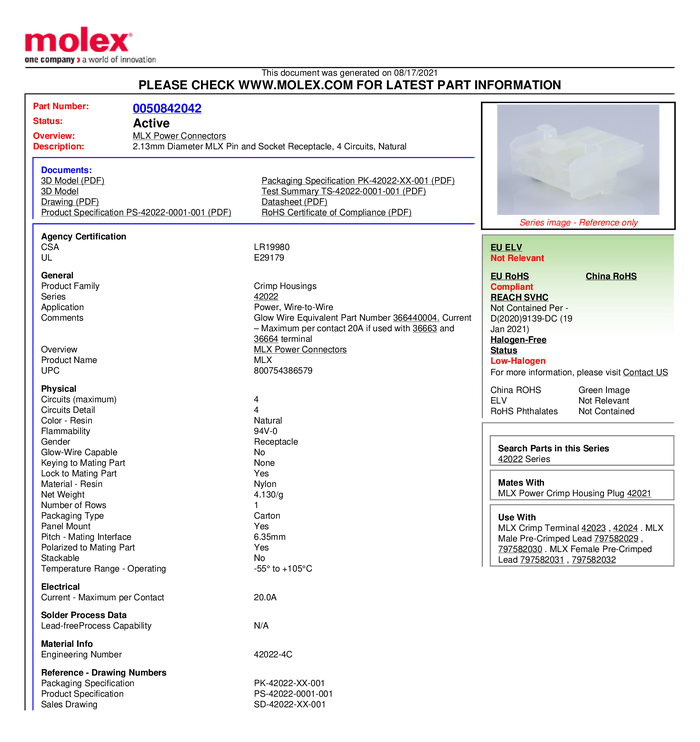 Molex Obudowa złącza pin żeńskiego na kabel Ilość pinów 4 Wymiary siatki: 6.35 mm 50842042 1 szt. karton