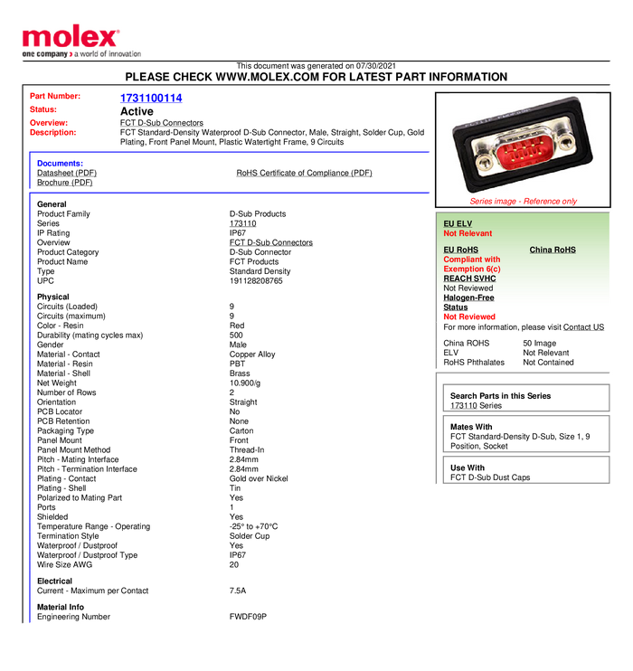 Molex Molex MOL Power & Signal Sol. 1731100114 Złącze męskie D-Sub Ilość styków: 9 lutowane 1 szt. karton
