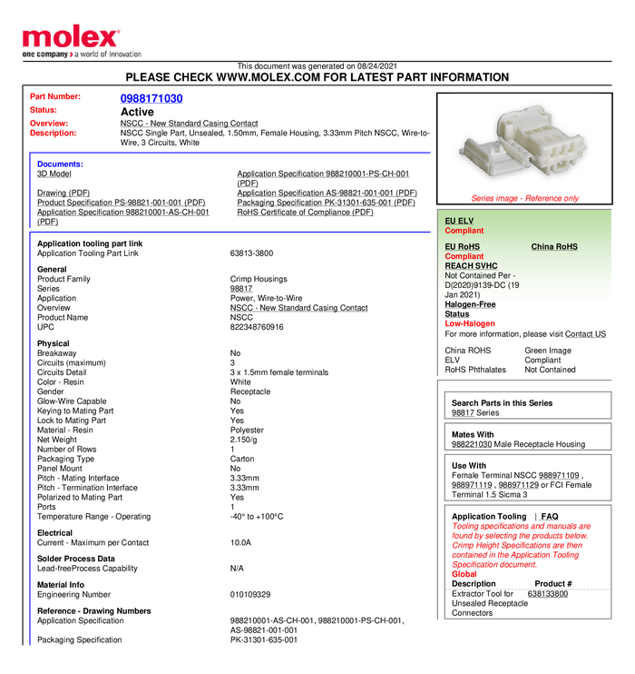 Molex Obudowa złącza pin żeńskiego na kabel Ilość pinów 3 Wymiary siatki: 3.33 mm 988171030 1 szt. karton