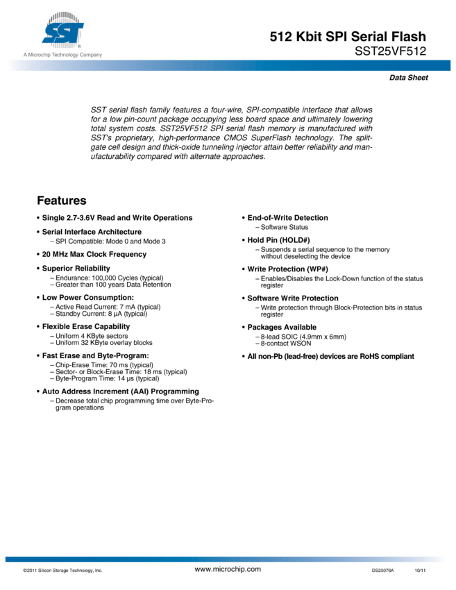 SST25VF512 Data Sheet - 512 Kbit SPI Serial Flash (10/12/2011)