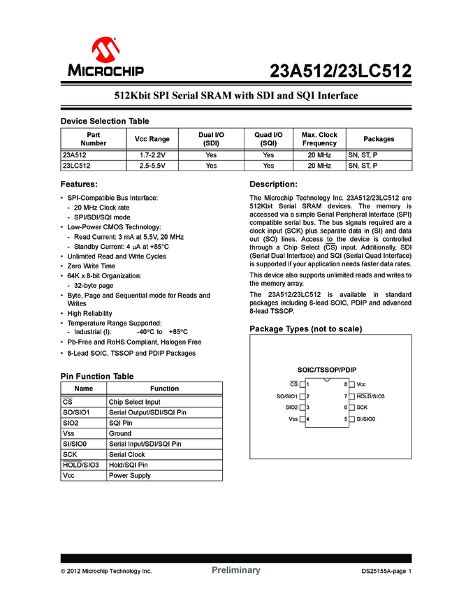 23A512/23LC512 512 Kbit SPI Serial SRAM with SDI and SQI Interface (09/28/2012)
