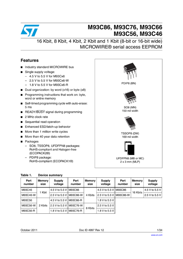 1 Kbit (8-bit or 16-bit wide) MICROWIRE serial access EEPROM