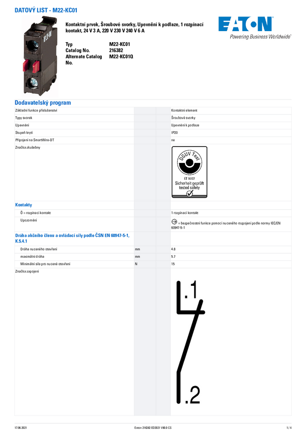 Element stykowy M22-KC01 1 NC 230 V/AC, 400 V/AC, 500 V/AC, 24 V/DC, 110 V/DC, 220 V/DC Eaton 216382 1 szt.