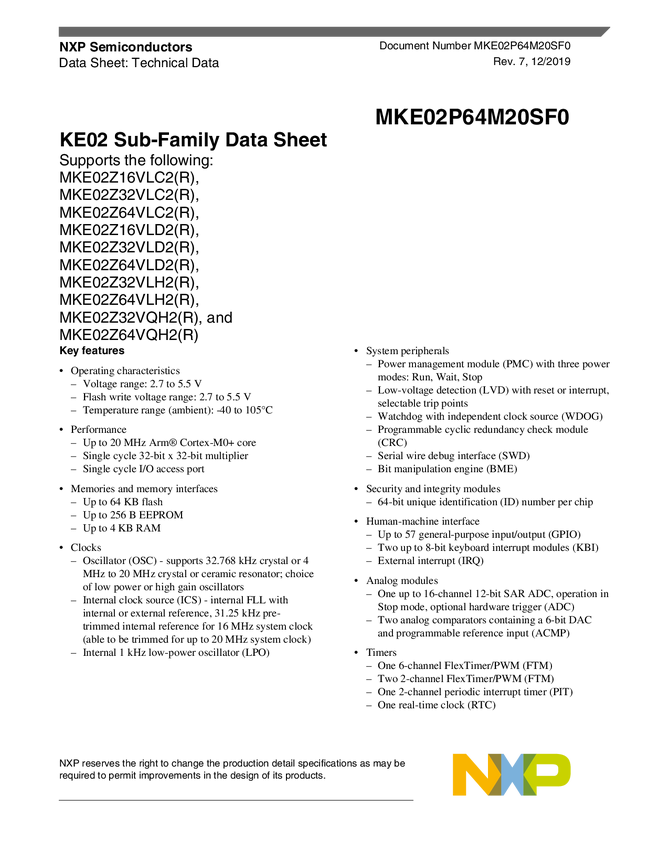 Kinetis<sup>&#174;</sup> KE02-20 MHz, Entry-Level Microcontrollers (MCUs) based on Arm<sup>&#174;</sup> Cortex<sup>&#174;</sup>-M0+ Core