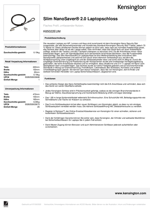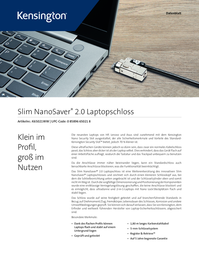 Blokada do laptopa Kensington Slim NanoSaver® 2.0