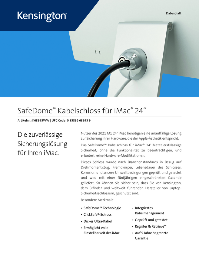 Blokada kablowa Kensington SafeDome™ do iMaca® 24"