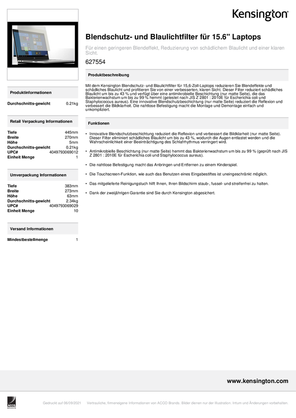 Kensington Anti-Glare Filtr antyrefleksyjny Notebook 39,6 cm (15,6") Format obrazu: 16:9 627554 Universal