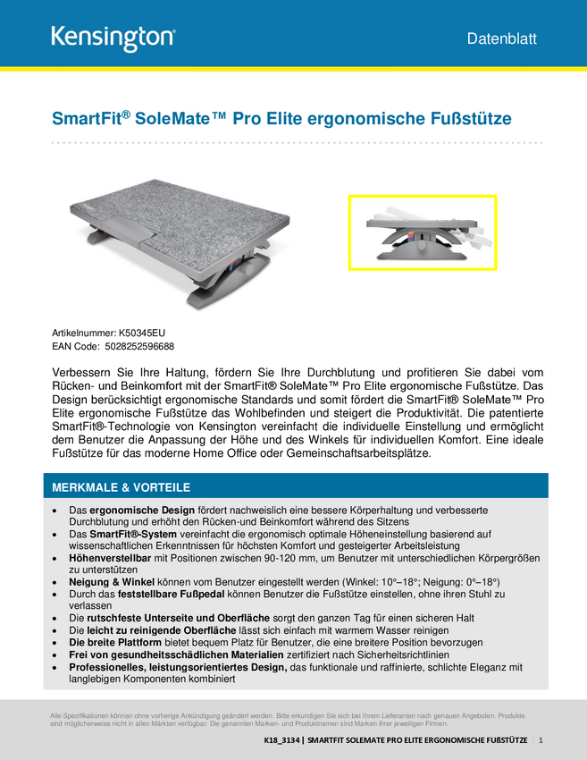 Kensington K50345EU SoleMate™ Pro Elite Podnóżek (S x G) 530 mm x 340 mm z regulacją pochylenia szary