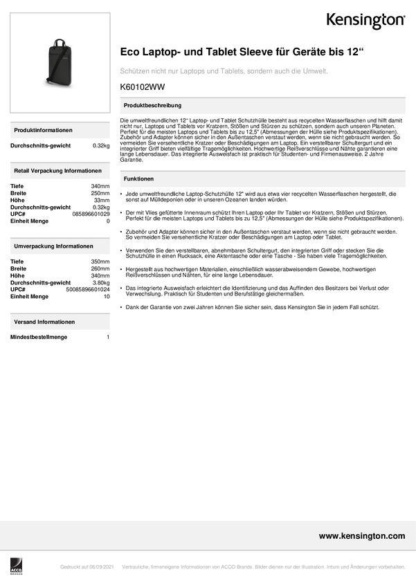 Etui, futerał na laptopa Kensington K60102WW, (S x W x G) 324 x 245 x 25 mm