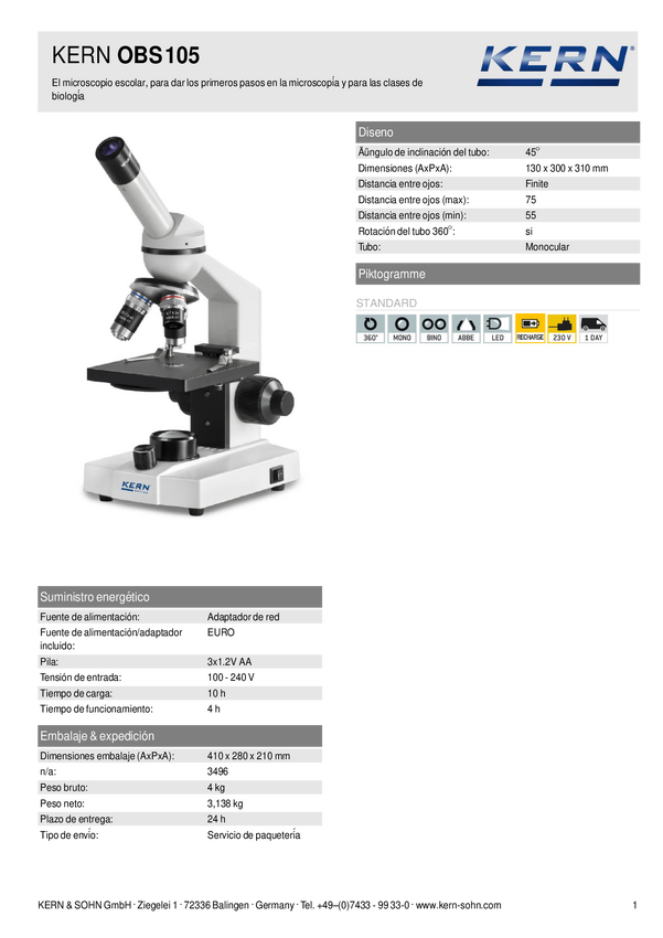 Kern OBS 105 OBS 105 Mikroskop światła przechodzącego jednookularowy 400 x światło przechodzące