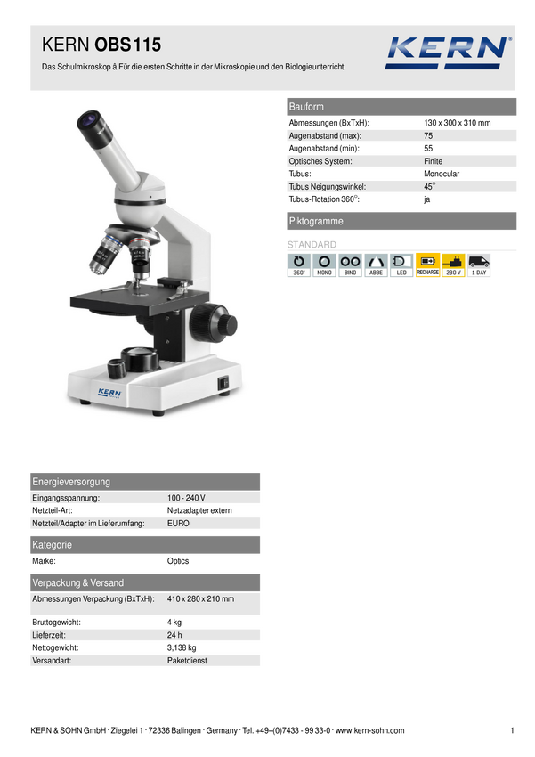 Kern OBS 115 OBS 115 Mikroskop światła przechodzącego jednookularowy 400 x światło przechodzące