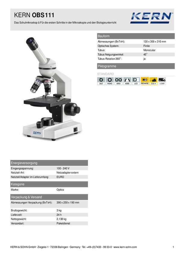 Kern OBS 111 OBS 111 Mikroskop światła przechodzącego jednookularowy 400 x światło przechodzące