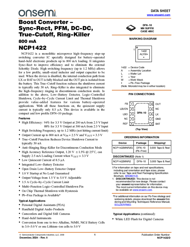 Boost Converter, Sync-Rect, PFM, DC-DC, 800 mA, with True-Cutoff and Ring-Killer
