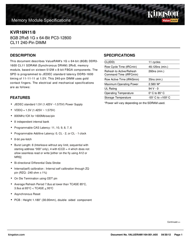 Kingston ValueRAM Pamięć robocza do PC - moduł DDR3 8 GB 1 x 8 GB Non-ECC 1600 MHz 240 pin DIMM CL11 11-11-35 KVR16N11/8