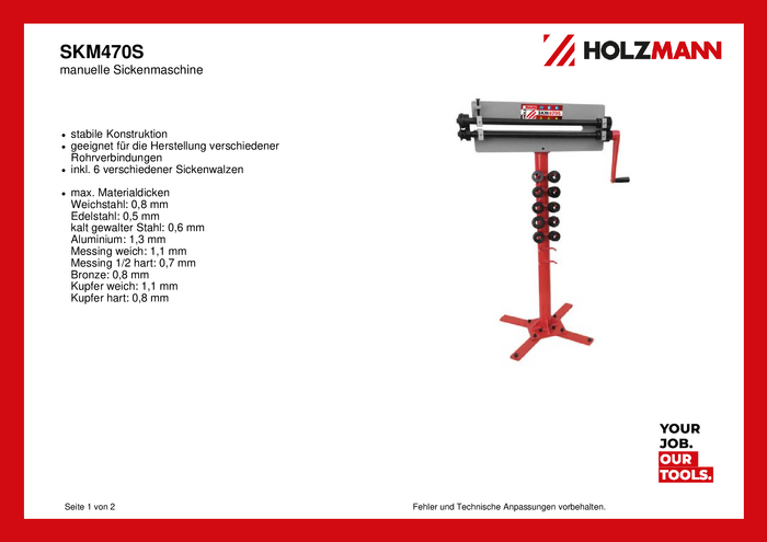 Maszyna frezująca Holzmann Maschinen SKM470S Stal miękka: 0,8 mm, stal nierdzewna: 0,5 mm, stal walcowana na zimno: 0,6