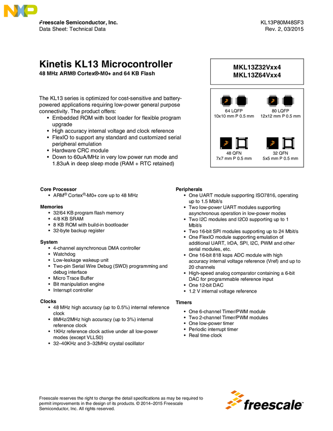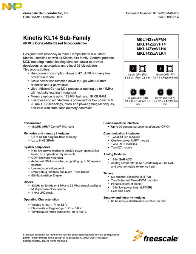 Kinetis<sup>&#174;</sup> KL1x-48 MHz, Mainstream Small Ultra-Low Power Microcontrollers (MCUs) based on Arm<sup>&#174;</sup> Cortex<sup>&#174;</sup>-M0+ Core