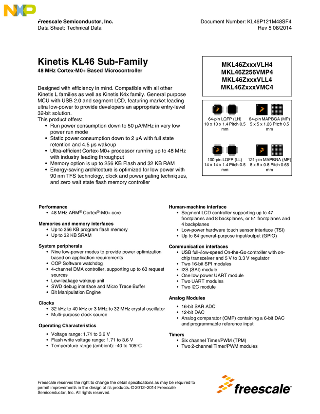 Kinetis KL46: 48MHz Cortex-M0+ Ultra-Low Power MCU, 256KB Flash, 32KB RAM, USB, Segment LCD, 64-BGA
