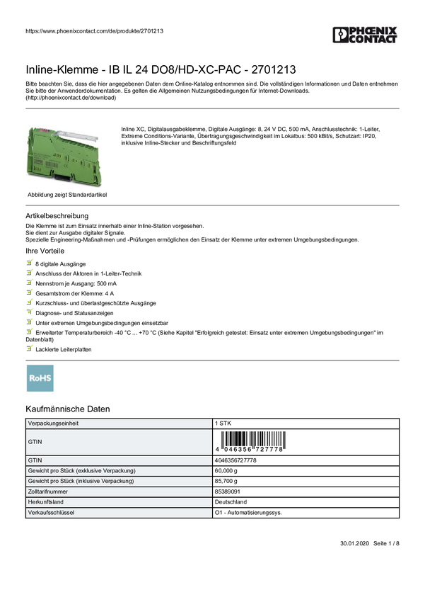 Phoenix Contact IB IL 24 DO8/HD-XC-PAC 2701213 Klema Inline 7.5 V/DC