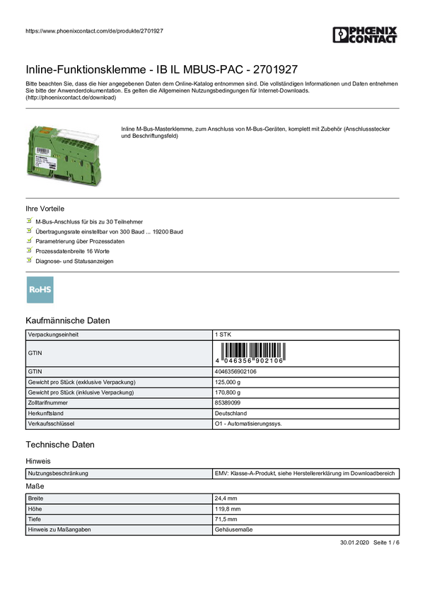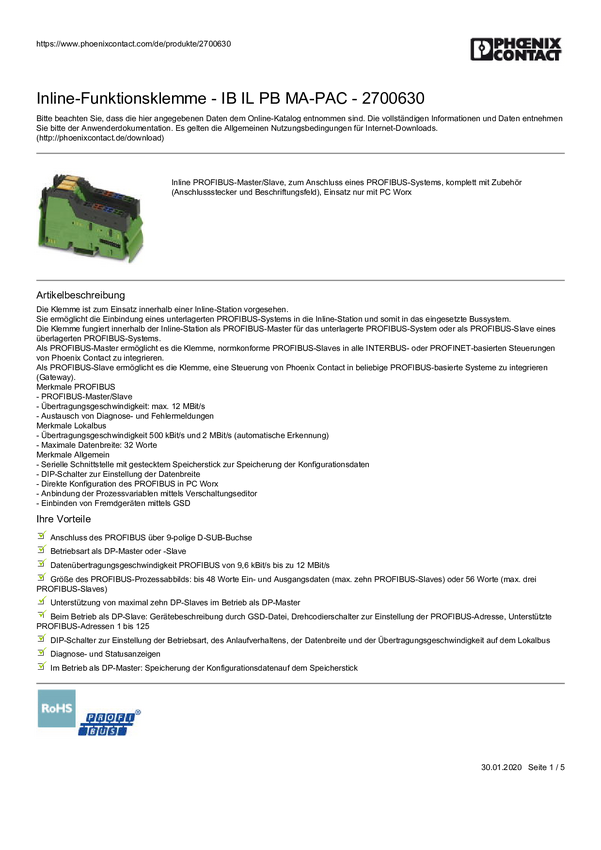 Phoenix Contact IB IL MBUS-PAC 2701927 Klema funkcyjna Inline 7.5 V/DC