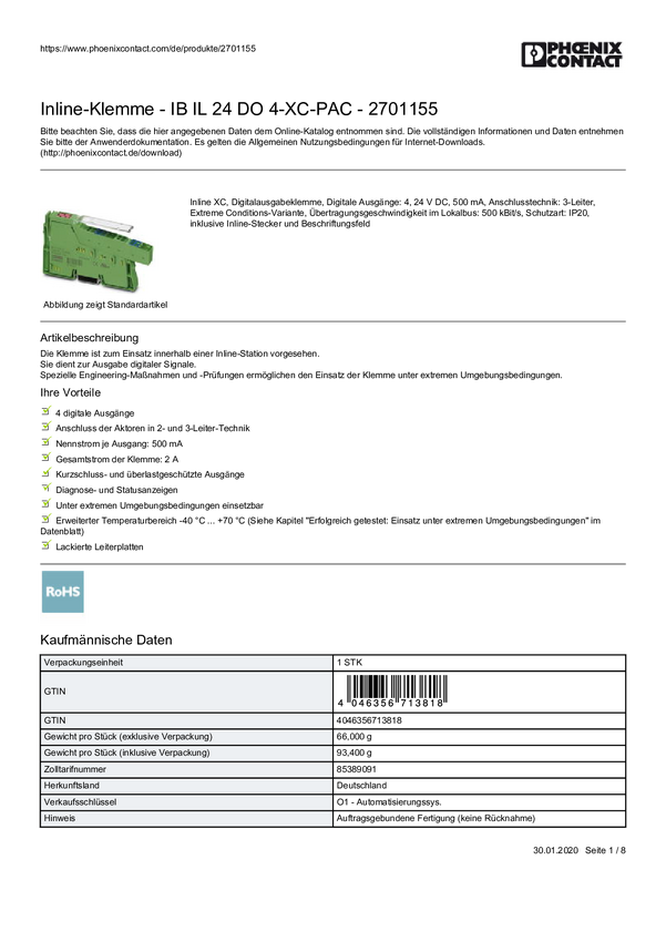 Klema Inline Phoenix Contact IB IL 24 DO 4/EF-ECO 2702825, 1 szt.