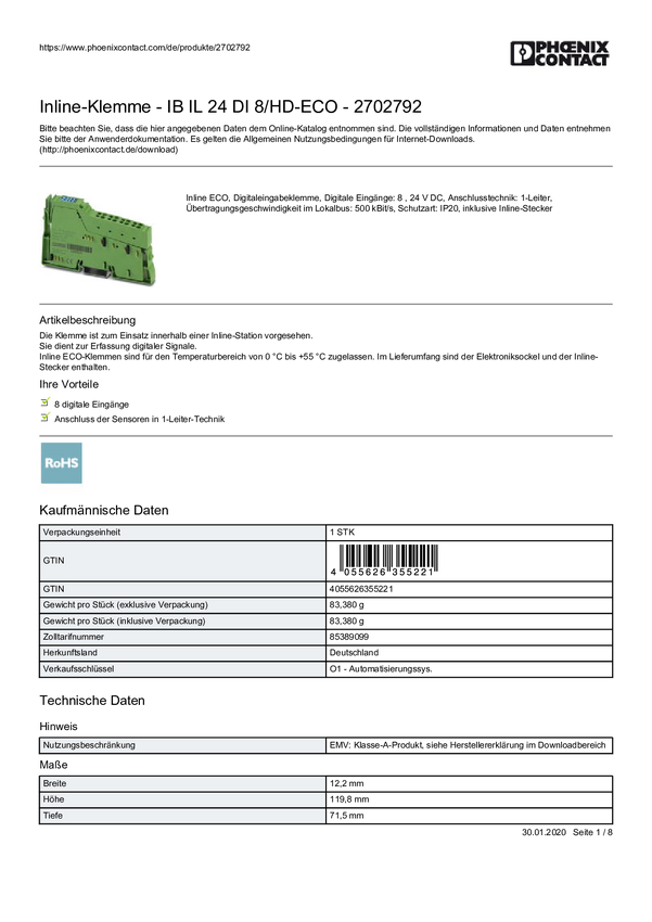 Phoenix Contact IB IL 24 DI 8/HD-ECO 2702792 Klema Inline 7.5 V/DC