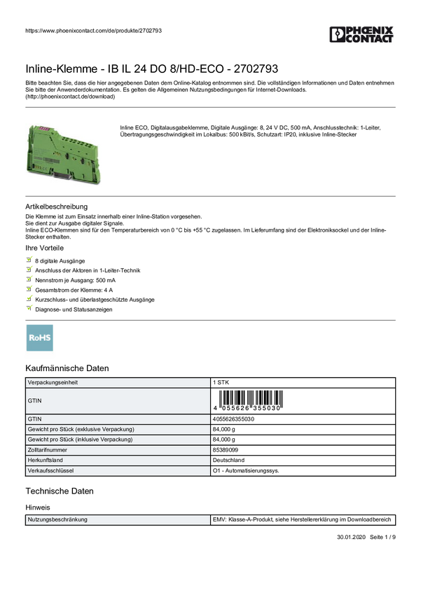 Klema Inline Phoenix Contact IB IL 24 DO 8/HD-ECO 2702793, 1 szt.