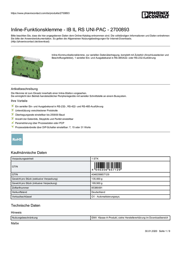 Klema funkcyjna Inline Phoenix Contact IB IL RS UNI-PAC 2700893, 1 szt.