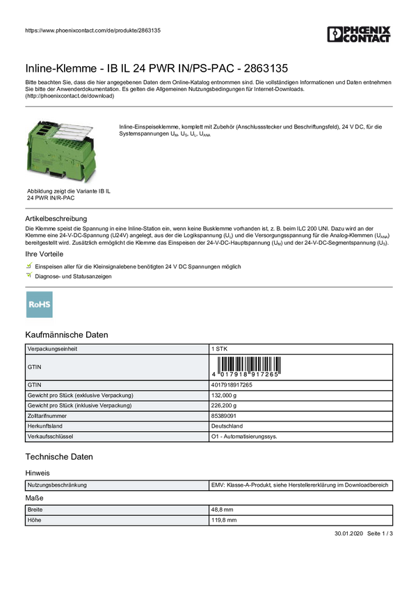 Phoenix Contact IB IL 24 PWR IN/PS-PAC 2863135 Klema Inline 7.5 V/DC