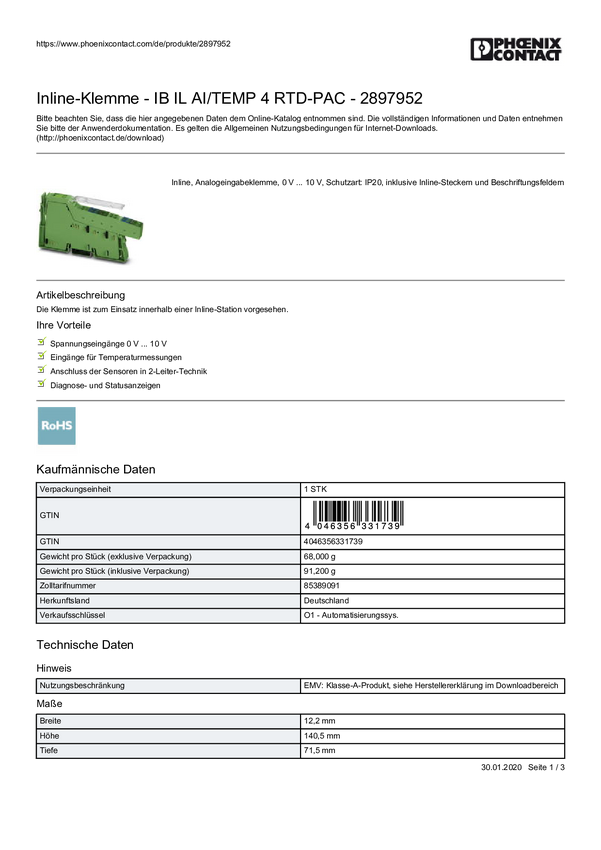Klema Inline Phoenix Contact IB IL AI/TEMP 4 RTD-PAC 2897952, 1 szt.