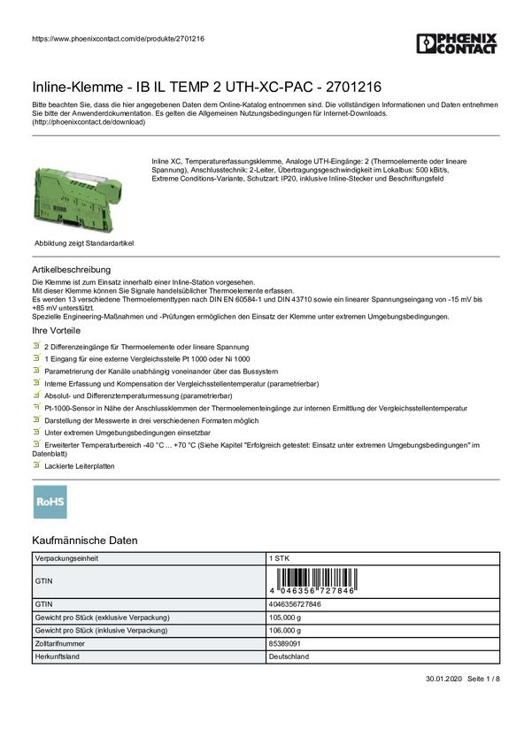 Phoenix Contact IB IL TEMP 2 UTH-XC-PAC 2701216 Klema Inline 7.5 V/DC