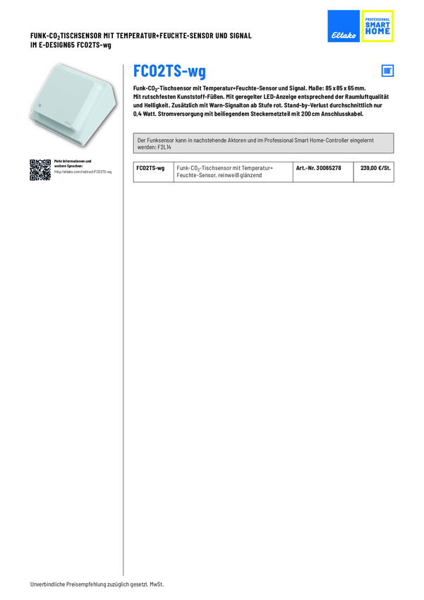 FCO2TS-wg Eltako bezprzewodowy Czujnik jakości powietrza CO2 / regulator klimatu w pomieszczeniu