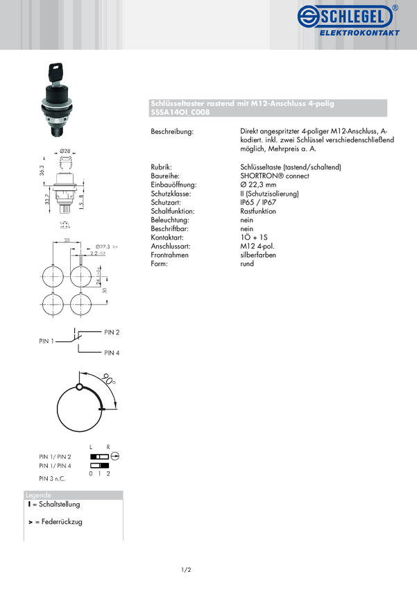 Schlegel SSSA18OI_C008 SSSA18OI_C008 Przycisk kluczykowy manualne, klucz 1 szt.