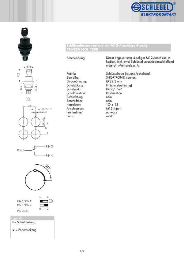 Schlegel SSWSSA18OI_C008 SSWSSA18OI_C008 Przycisk kluczykowy manualne, klucz 1 szt.