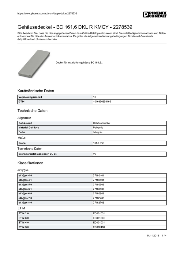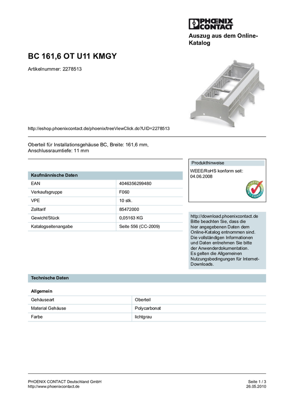 Część górna do obudowy na szynę DIN poliwęglan Phoenix Contact BC 161,6 OT U11 KMGY 2278513 11 mm (D x S x W) 89.7 x 161