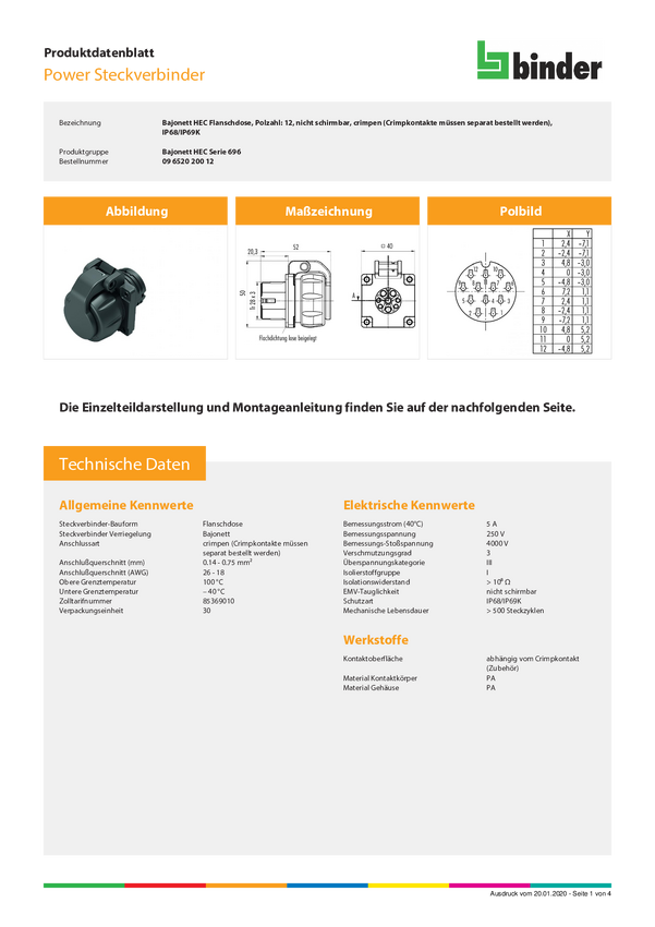 binder 09 6520 200 12 Złącze okrągłe złącze żeńskie z kołnierzem Łączna ilość styków: 12 1 szt.