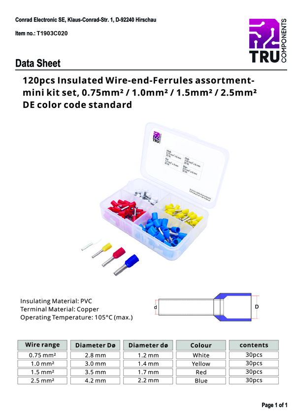 TRU COMPONENTS T1903C020 Zestaw końcówek rurkowych, z częściową izolacją , 0.75 mm², 120 szt.