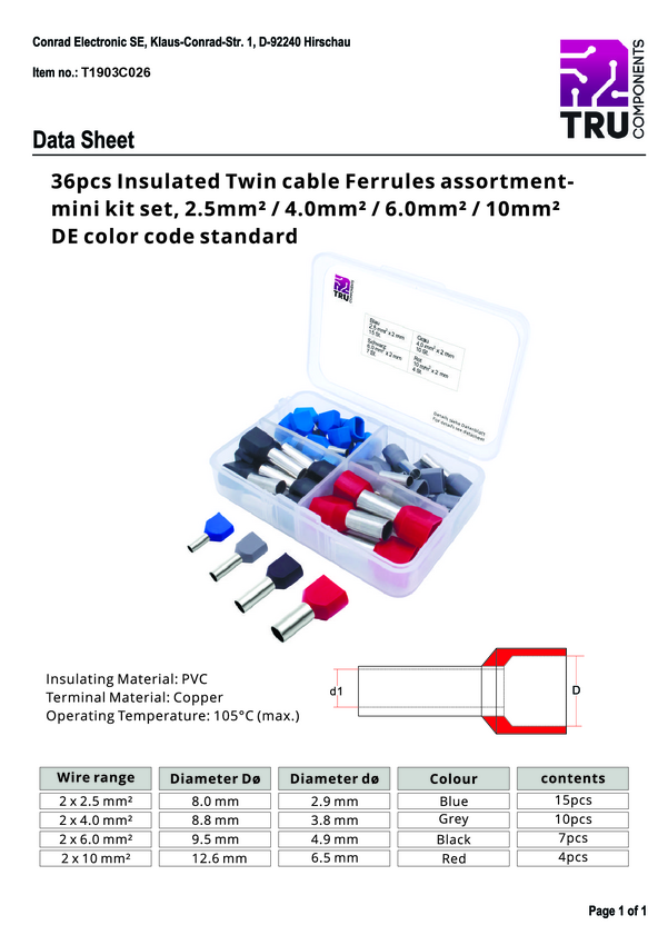 TRU COMPONENTS T1903C026 Zestaw końcówek rurkowych, z częściową izolacją , 2.5 mm², 36 szt.