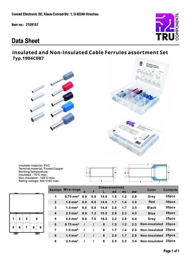 TRU COMPONENTS T1903C034 Zestaw końcówek rurkowych, bez izolacji, 0.75 mm², 1020 części