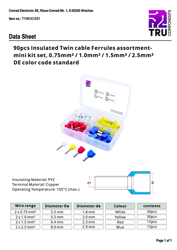 TRU COMPONENTS T1903C021 Zestaw końcówek rurkowych, z częściową izolacją , 0.75 mm², 90 szt.
