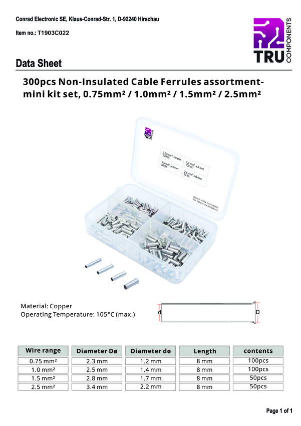 TRU COMPONENTS T1903C022 Zestaw końcówek rurkowych, bez izolacji, 0.75 mm² x 8 mm, 300 szt.
