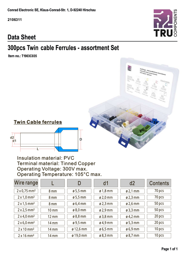 TRU COMPONENTS T1903C035 Zestaw końcówek rurkowych, z częściową izolacją , 0.75 mm², 300 części